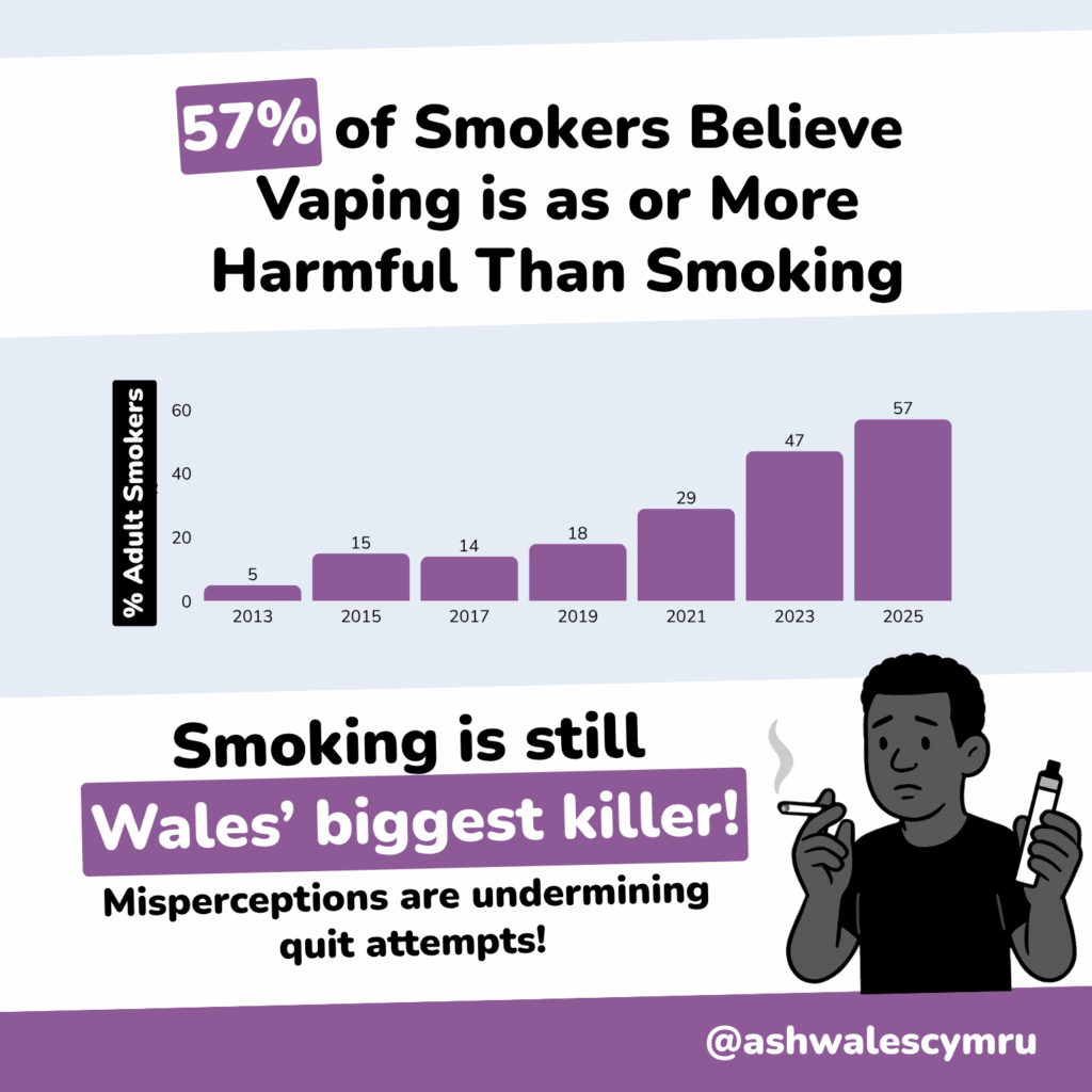 While public backing for stronger tobacco laws is high, confusion around vaping continues to rise. Nearly six in ten Welsh adults (58%) now believe vaping is as harmful as smoking, including 57% of smokers. In 2017, that figure was just 14%.