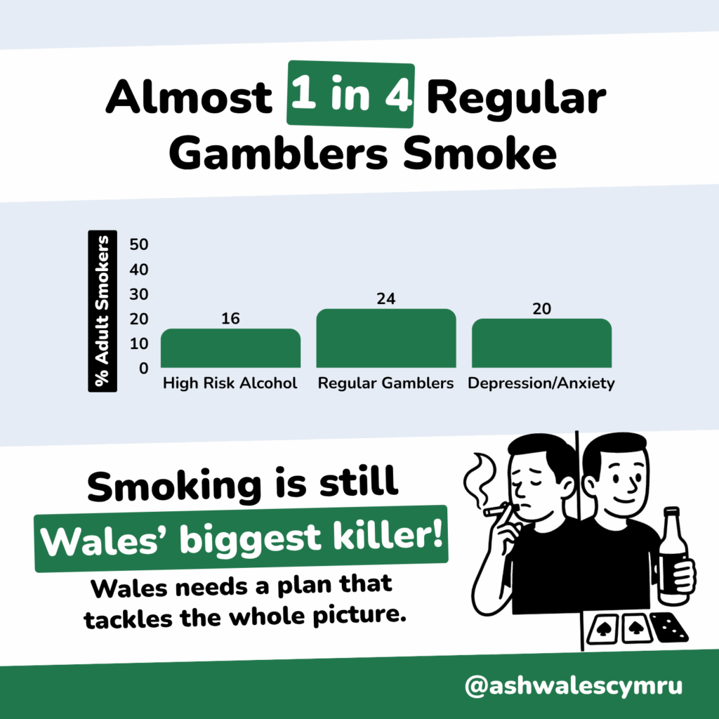 • Smoking is far more common among people facing overlapping challenges such as poor mental health, high-risk drinking, or frequent gambling.