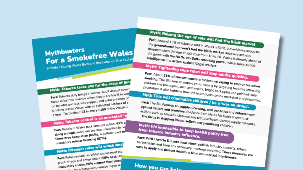This Mythbusters resource brings together clear evidence to challenge common myths that slow progress on tobacco control in Wales. It is designed to support policymakers, partners and advocates with concise, credible facts that can be used in briefings, discussions and decision-making. The resource draws on Welsh and international evidence to show what works, why it works, and how strong tobacco control protects health, reduces inequality and benefits communities across Wales.